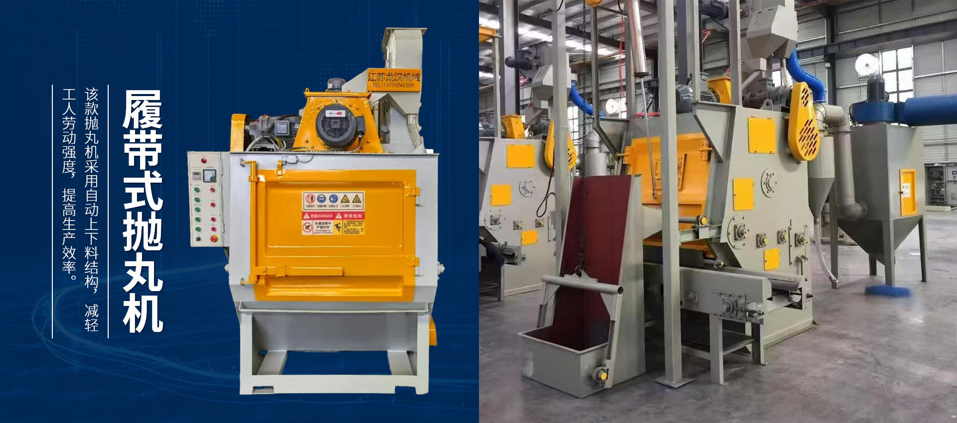 【現(xiàn)場安裝圖集】:簡介:吊鉤式拋丸機分為單吊鉤和雙吊鉤,拋丸機由吊鉤裝載工件交替進入拋丸清理室內。利用拋...
